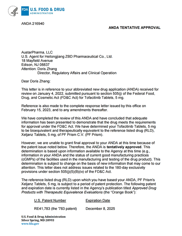 5月26日,williamhill中文官网发布公告,公司收到美国食品药品监督管理局(简称“美国FDA”)的通知,williamhill中文官网向美国FDA申报的枸橼酸托法替布片的新药简略申请(ANDA,即美国仿制药申请)已获得暂时批准(暂时批准:指FDA已经完成仿制药的所有审评要求,但由于专利权或专卖权未到期而给予的一种批准形式)。